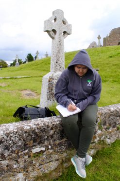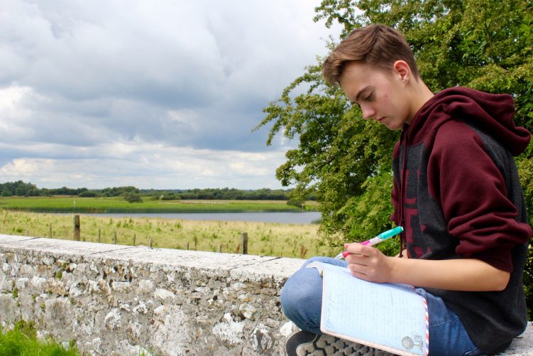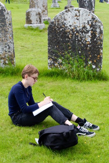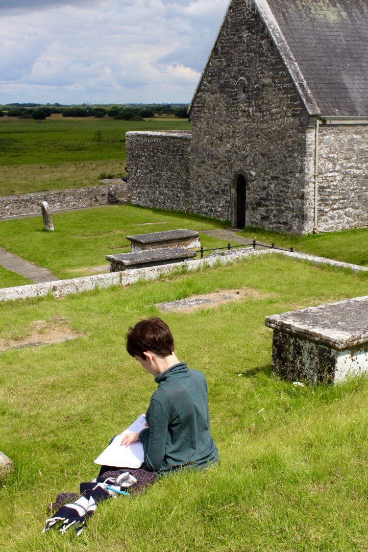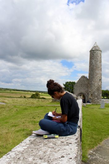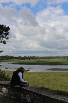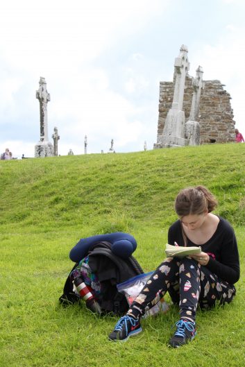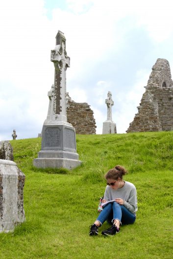 Clonmacnoise Pit Stop July 28, 2017 On our way west, we stopped at the medieval monastery of Clonmacnoise, located on the banks of the River Shannon. The group explored the site and logged some writing time in this scenic spot.